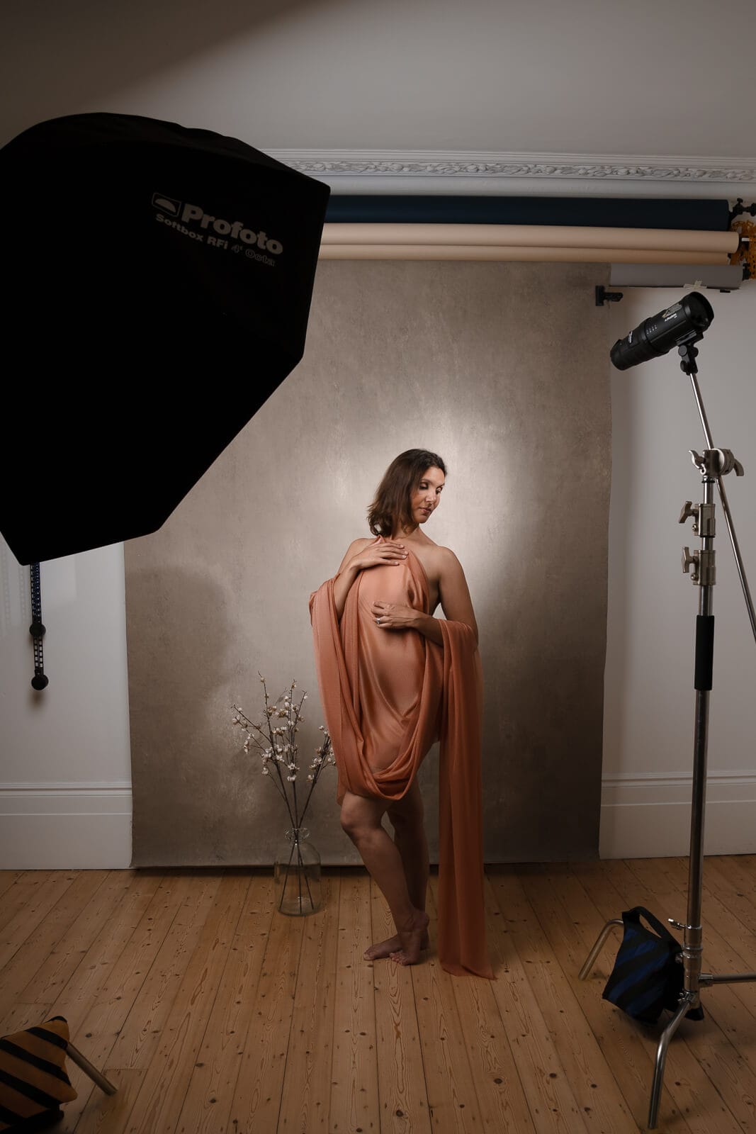 When AR walked into my studio on her boudoir photoshoot for mums UK, she carried a beautiful mix of excitement and vulnerability. She’d been inspired by the mood boards we explored together and her own love for dance-like expression. She envisioned something romantic yet sultry. Drawing from my ‘Ravishing Renaissance’ painterly aesthetic and the allure of dark, moody tones, we curated a shoot that celebrated all sides of her personality.